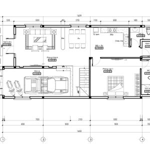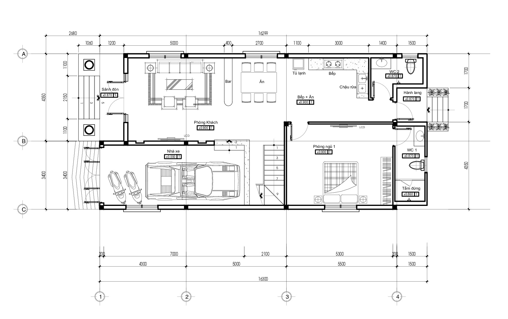 Tầng trệt có diện tích sàn xây dựng là 126.3m2, được bố trí phòng khách, bếp, phòng ăn, phòng ngủ bố mẹ và garage
