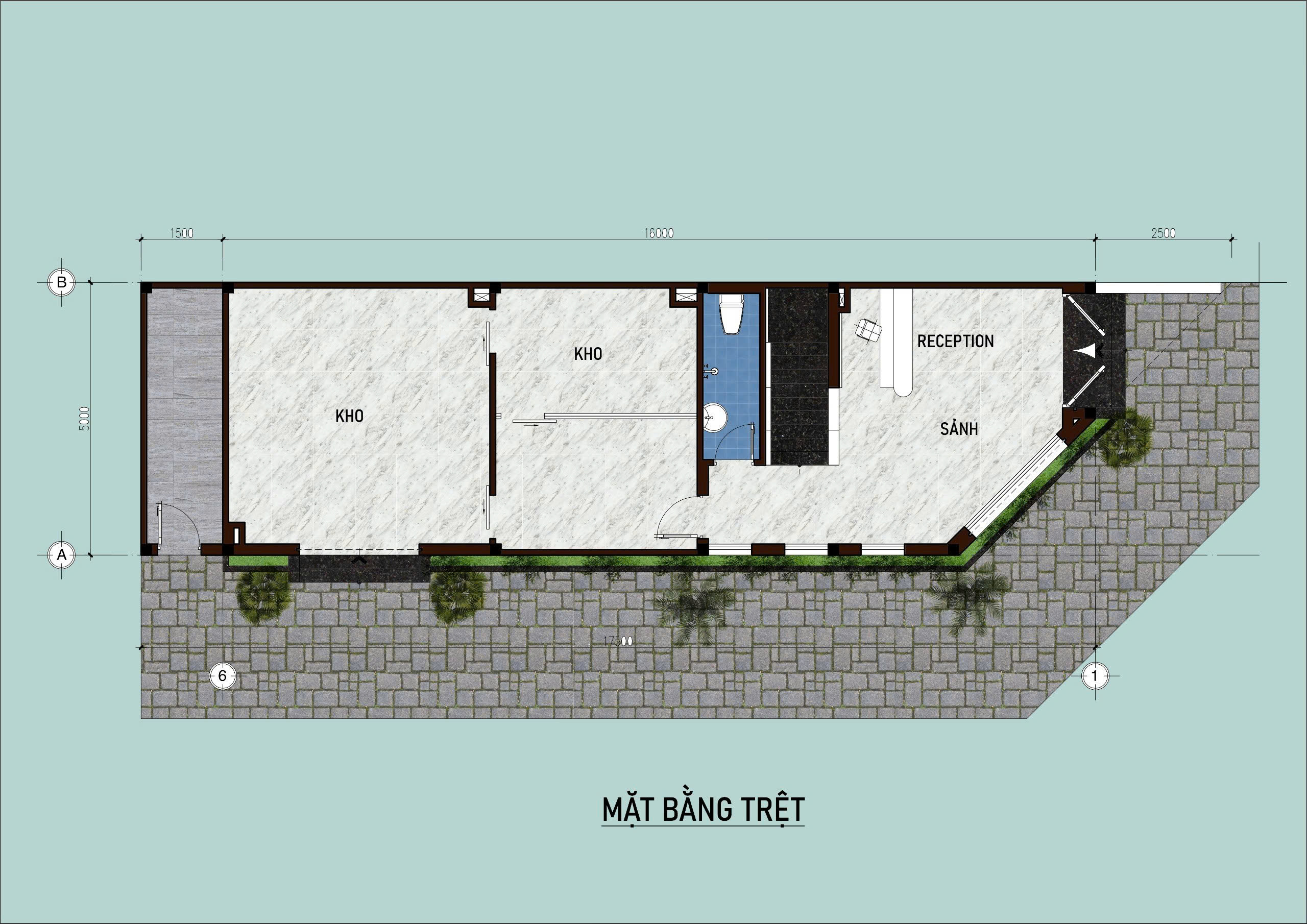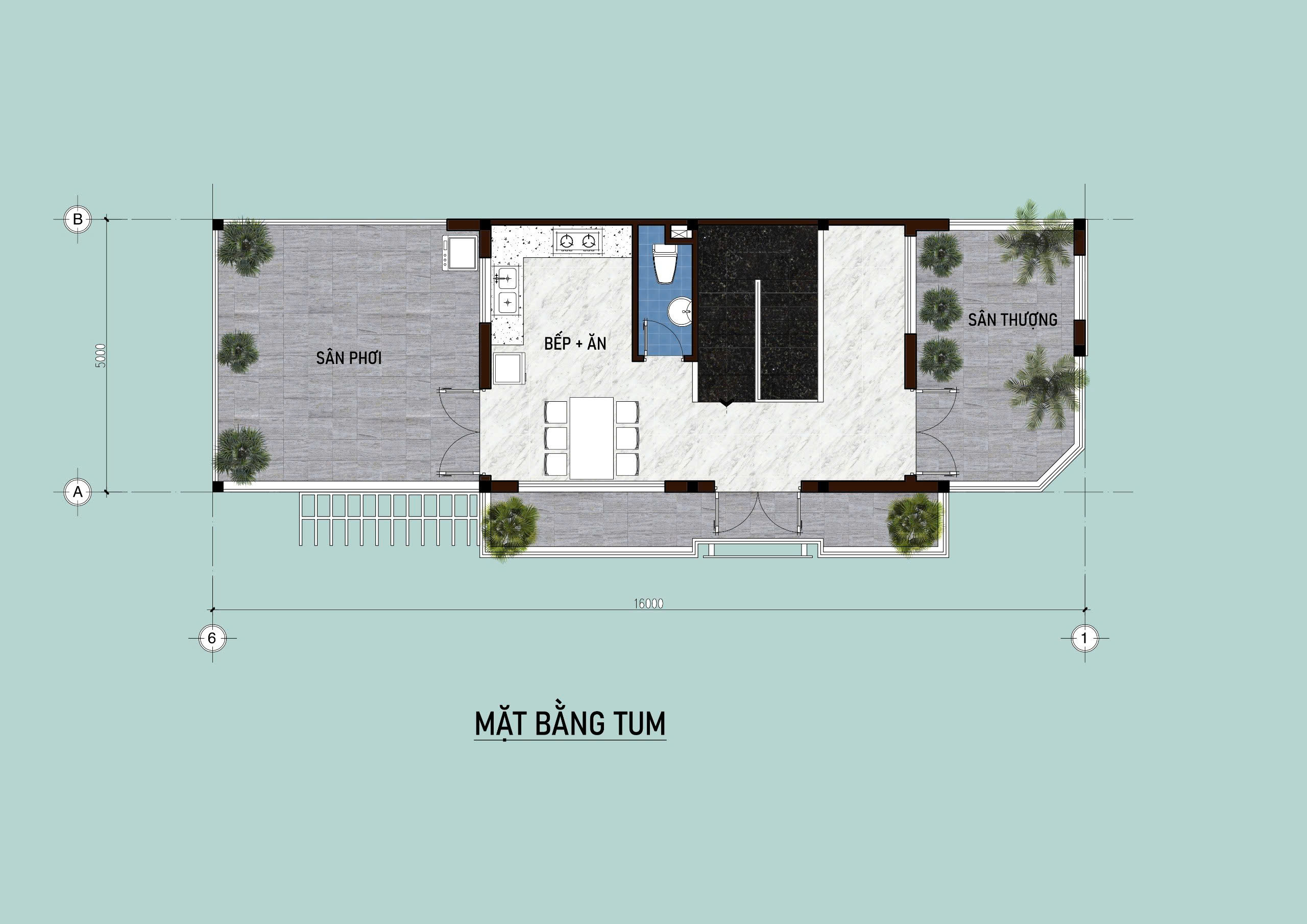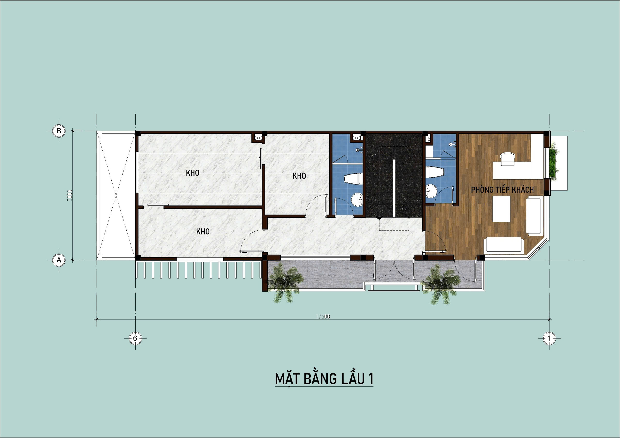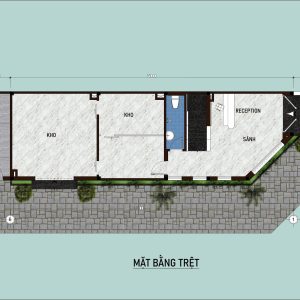 Diện tích đất xây dựng: 5mx20m = 100m2, vạt góc 2.5mx2.5m